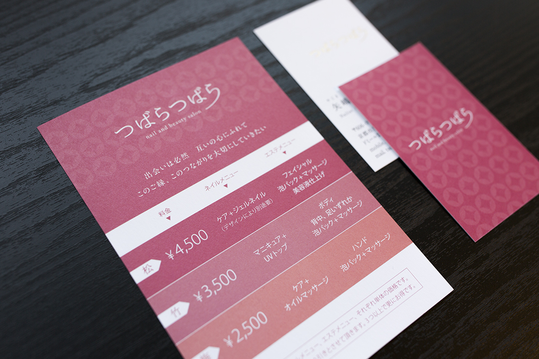 つばらつばら 2017.09.08 ALL, WORKS nail and beauty salon「つばらつばら」のロゴ・DM・名刺のデザイン。ひらがなのロゴと和柄モチーフのデザインで、女性らしく上品に仕上げました。 Greasetrap COCHIN MOON